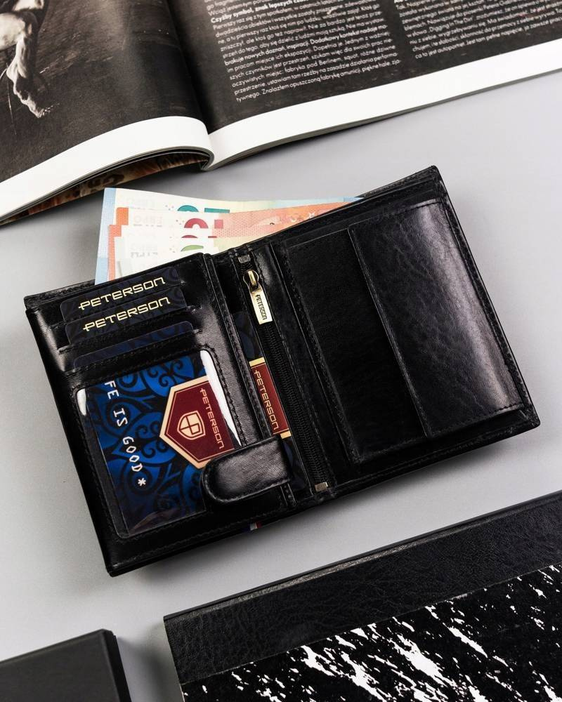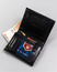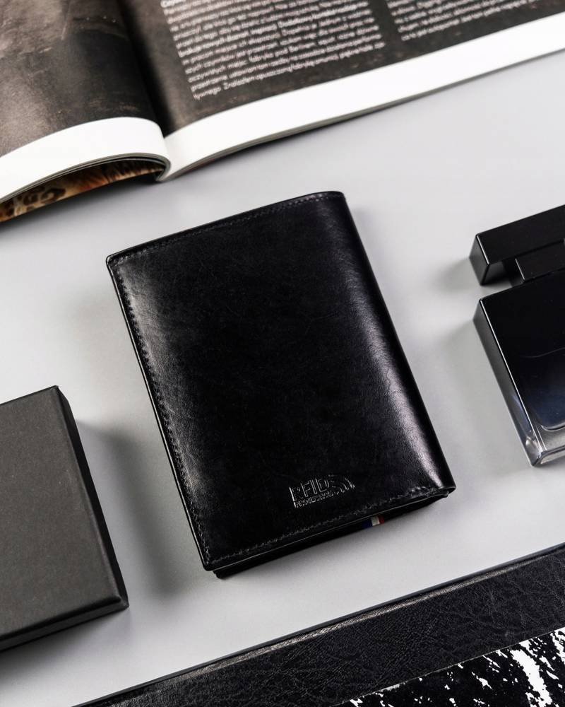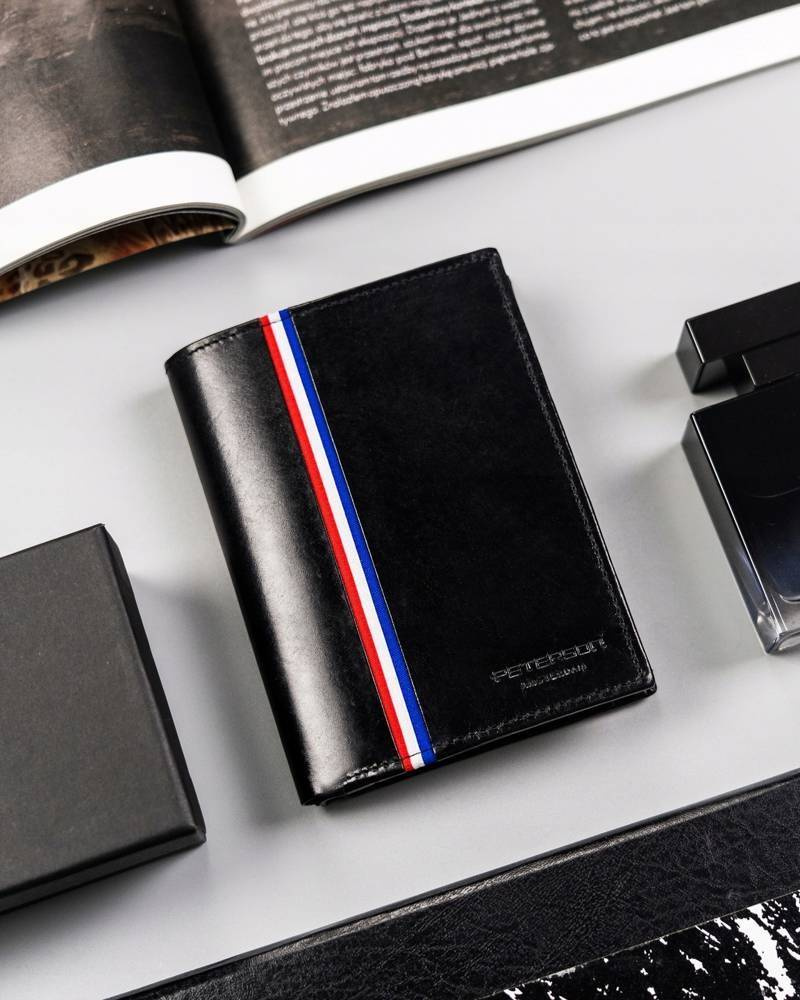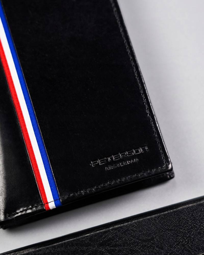 • Ergonomiczny design | Odszyty bardzo trwale z doskonałej jakości gładkiej skóry naturalnej w czarnym kolorze, dodatkowo na froncie portfela wyszyto trójkolorowy paseczek;