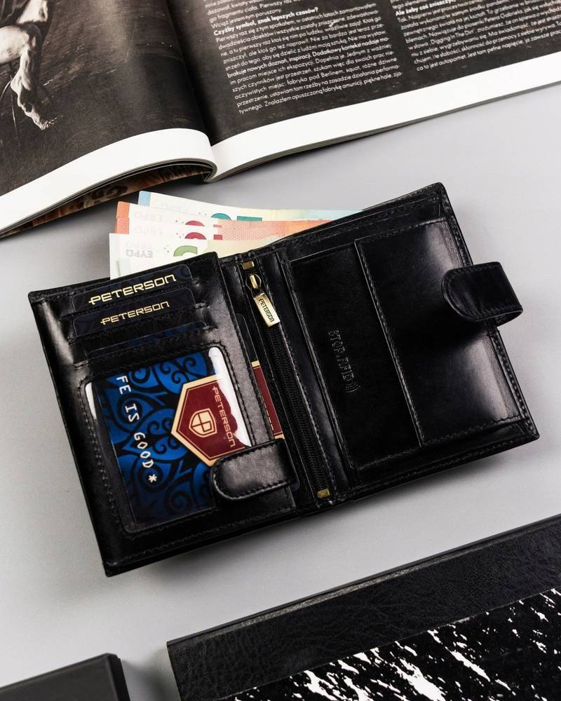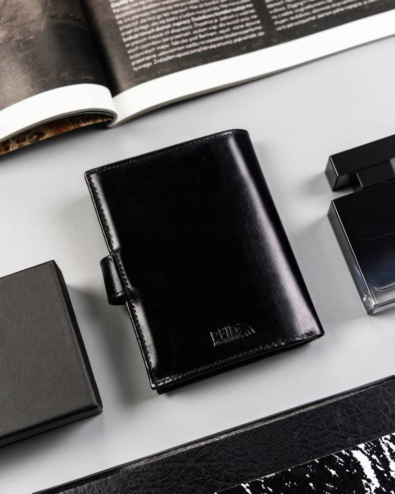 • Duży portfel o klasycznej stylistyce. Model w orientacji pionowej zapinany na zatrzask;