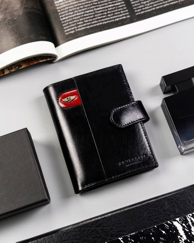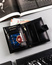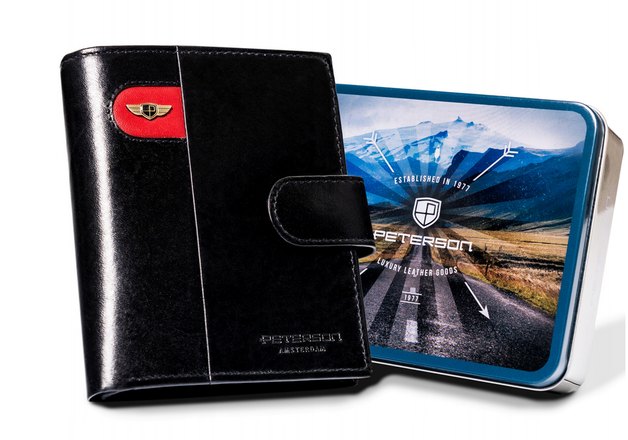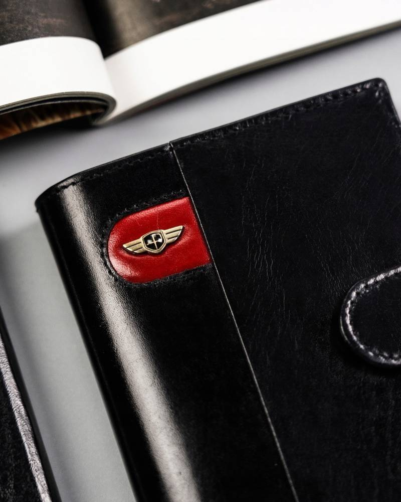 • Ergonomiczny design | Odszyty bardzo trwale z doskonałej jakości gładkiej skóry naturalnej w czarnym kolorze, dodatkowo na froncie portfela wyszyto trójkolorowy paseczek;