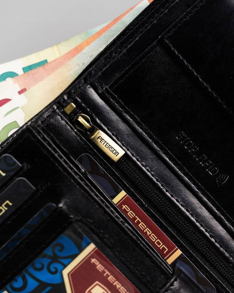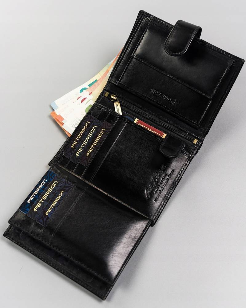 • banknoty schowasz do 2 otwartych przegródek wyszytych po całej szerokości portfela.