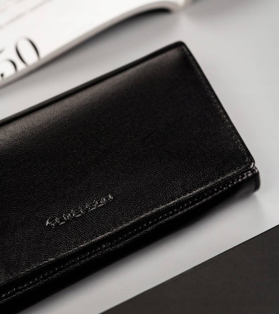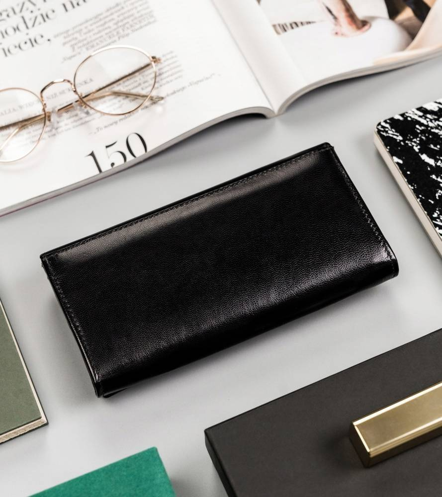 - Ponadczasowy dodatek | Portfel o klasycznej stylistyce. Model w orientacji poziomej, zapinany bezpiecznym i trwałym zatrzaskiem;