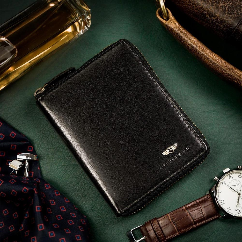 - Ponadczasowy fason dla Panów w każdym wieku | Portfel o klasycznej stylistyce. Model w orientacji pionowej zamykany suwakiem;