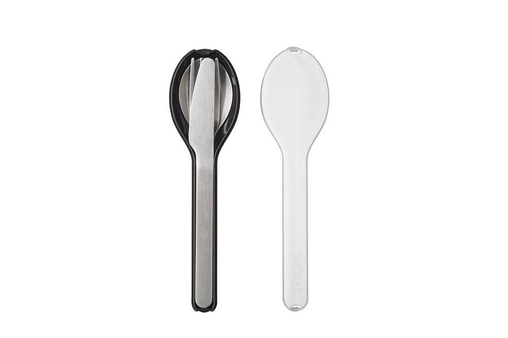 Przenośny zestaw Ellipse składający się z noża, widelca i łyżki zapakowanych w praktyczne i higieniczne etui z tworzywa sztucznego.