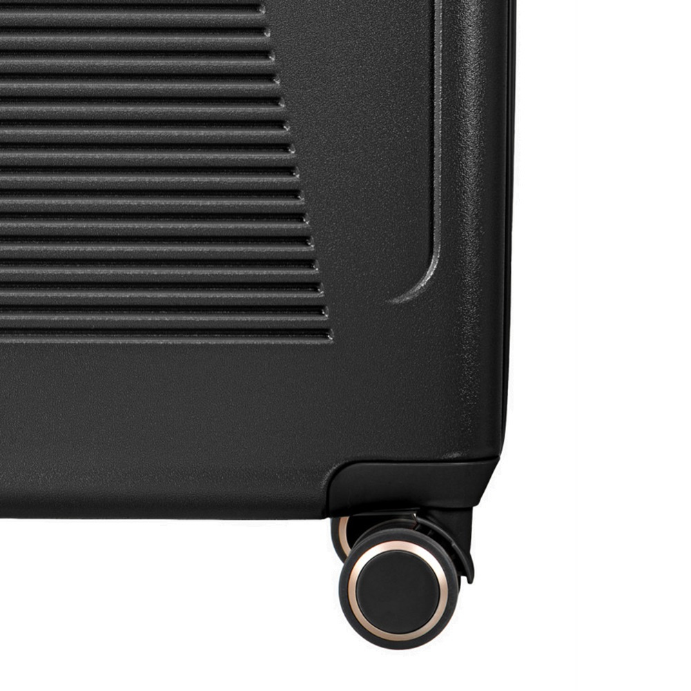 • 4 podwójne koła (spinner 360) (koła wykonane z gumy i PVC co dodatkowo wzmacnia je przed uderzeniami zewnętrznymi, oś na której zamocowane zostało koło  wzmocniona pyłem diamentowym)