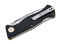 Ostrze typu droppoint wykonane z D2 otwiera się płynnie przez płetwę lub otwór na kciuk i ma delikatne wykończenie linii włosów.