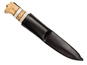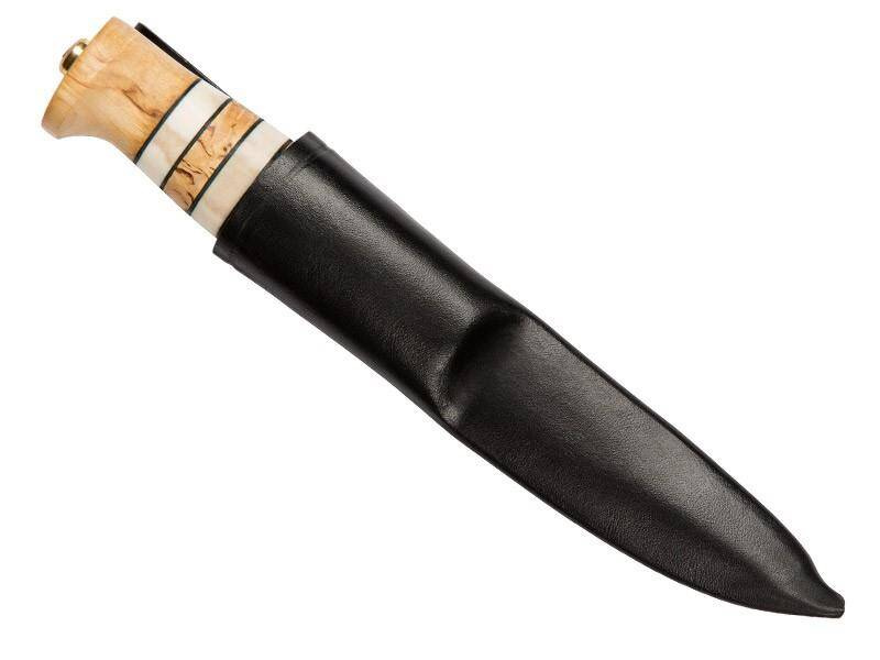 Stal 3-warstowy laminat, rękojeść brzoza, skóra i poroże, długość klingi 87 mm, całkowita 191 mm, pochwa skórzana, waga 26 g.