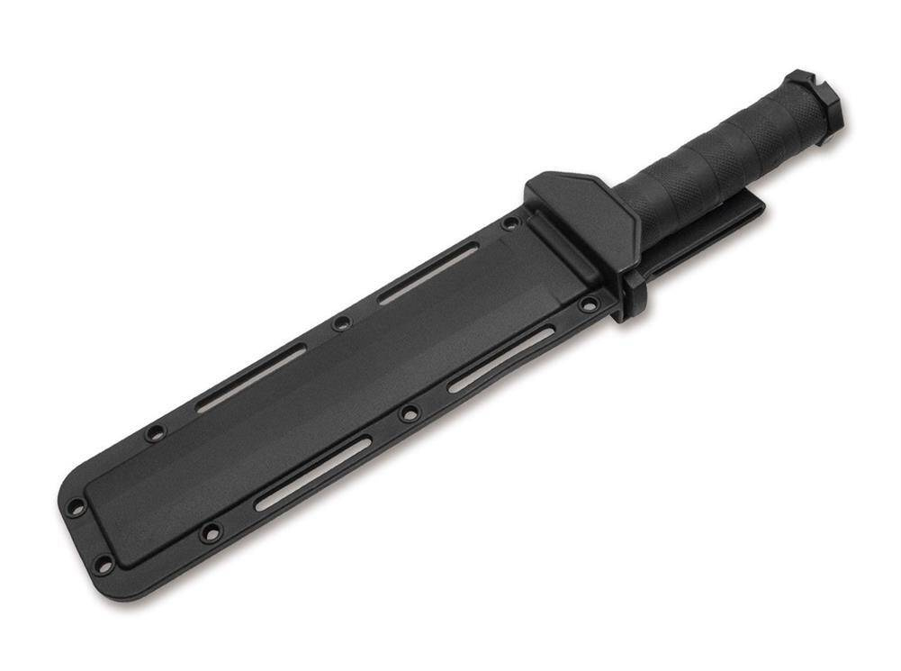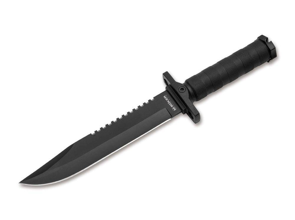 Potężne ostrze Bowie wykonane ze stali nierdzewnej i odpornej na wstrząsy 7Cr17MoV jest pomalowane na czarno i dodatkowo wyposażone w typową piłę tylną.