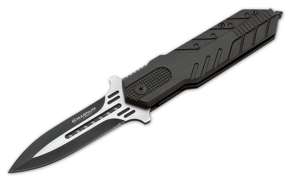 Ten wyjątkowy element taktyczny ma uderzająco frezowane dwukolorowe wykończenie ostrza ze stali nierdzewnej 440. Flipper zapewnia ochronę dłoni, a aluminiowe łuski mieszczą stalową wkładkę dla solidnego mechanizmu blokady wkładki. Posiada również zbijak do szkła i klips do kieszeni.