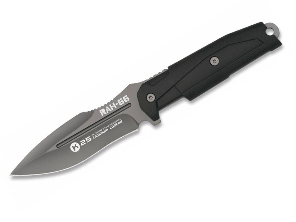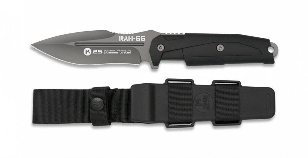 Głownia ze stali 7Cr17Mov z tytanową powłoką, długość całkowita 240 mm, długość klingi 115 mm, grubość klingi 3.8 mm, waga 165 g, rękojeść gumowana, w komplecie nylonowa pochwa.