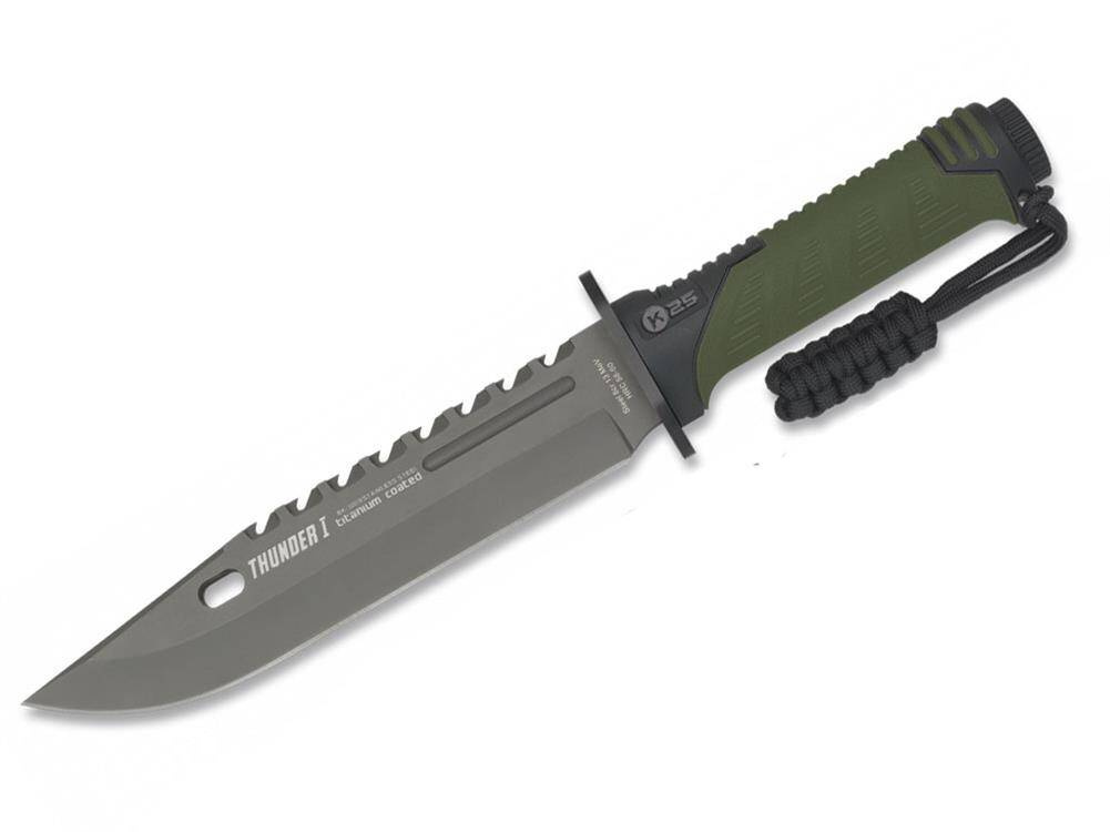 Głownia ze stali nierdzewnej z tytanową powłoką, długość całkowita 325 mm, długość klingi 200 mm, grubość klingi 5.5 mm, waga 335 g, rękojeść guma / ABS, w komplecie nylonowa pochwa i zestaw surwiwalowy.