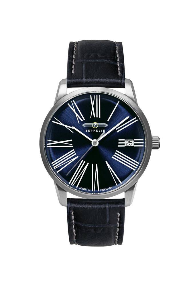 Ronda 715, średnica 35 mm, wysokość 9 mm, tarcza granatowa, indeksy białe, wskazówki białe i srebrna, koperta stalowa, dekiel stalowy, szkło mineralne K1, datownik, pasek skórzany, WR 5 ATM