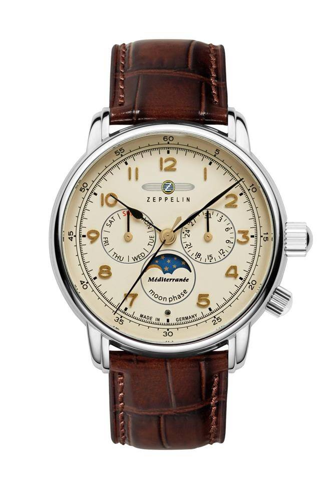 Ronda 706.1, tarcza beżowa, rozszerzony datownik, fazy księżyca, szkło mineralne K1, średnica 42 mm, wysokość 12 mm, kopera stalowa, dekiel stalowy, pasek skórzany, WR 5 ATM