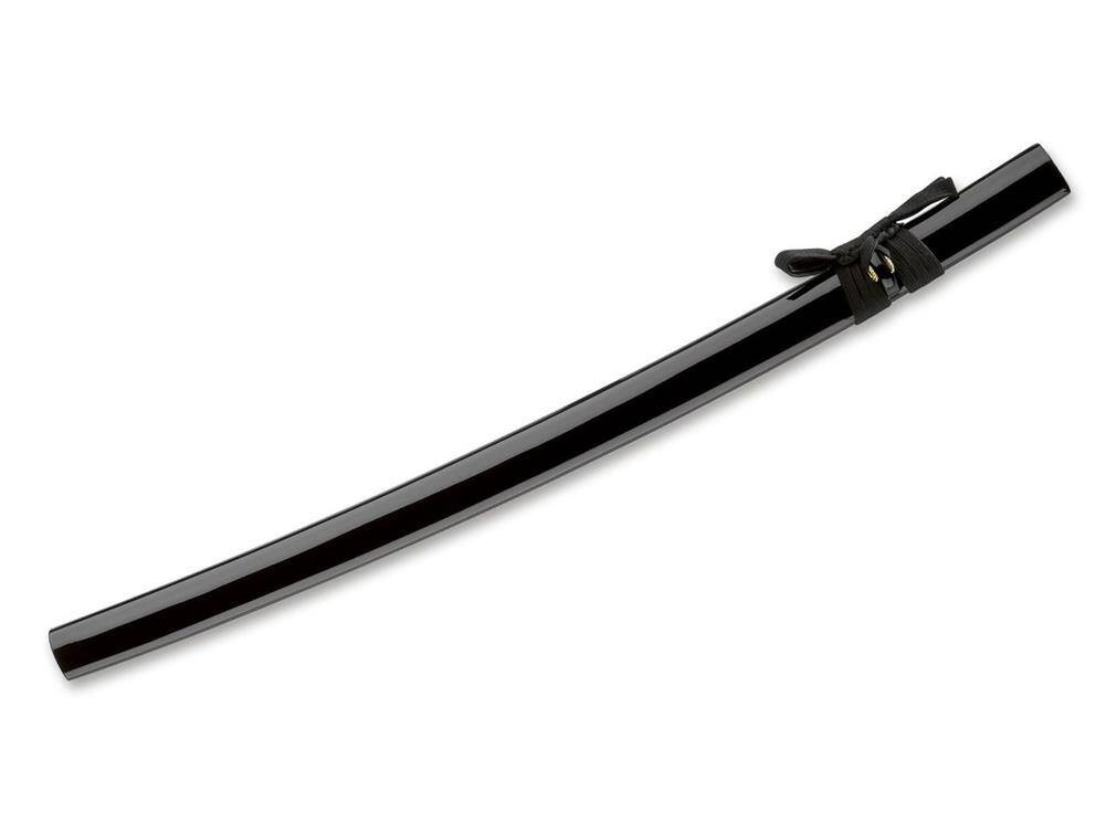 Ten wysokiej jakości miecz z pewnością zrobi na Tobie wrażenie od pierwszego wejrzenia! Ostrze o długości 71 cm wykonane z 200 warstw ręcznie kutego damastu, autentyczna rękojeść z podszewką z prawdziwej skóry manty oraz tradycyjne opakowanie czynią ten klejnot prawdziwym arcydziełem. W dawnych czasach status społeczny samurajów można było rozpoznać po wykonaniu miecza. Tsuba jest ozdobiona japońskimi motywami i ma delikatne antyczne wykończenie. Dyskretna drewniana Saya została pokryta błyszczącym czarnym lakierem. Zawiera zestaw do konserwacji miecza i autentyczną sakiewkę.