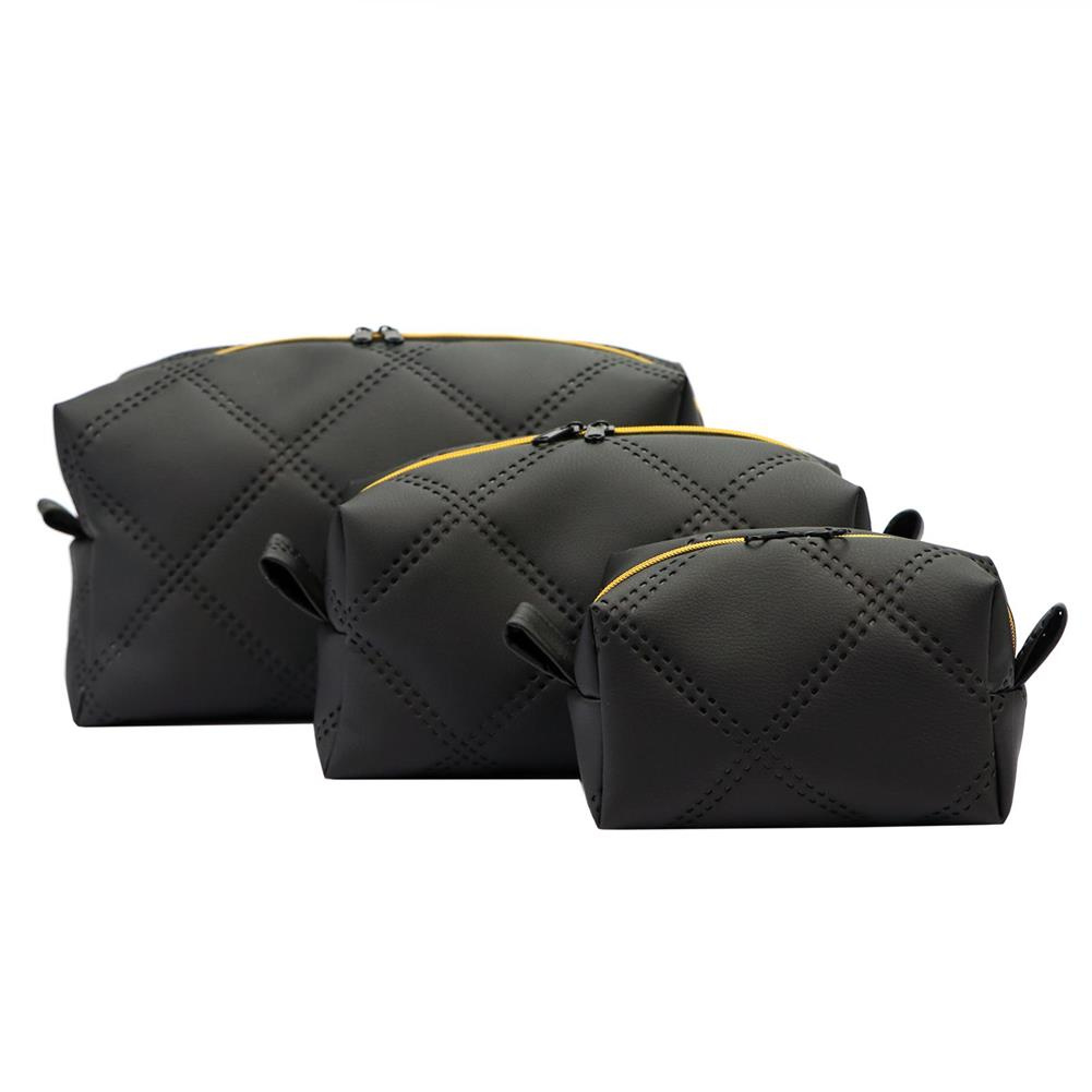 Zestaw trzech kosmetyczek wykonanych z wysokiej jakości skóry ekologicznej.