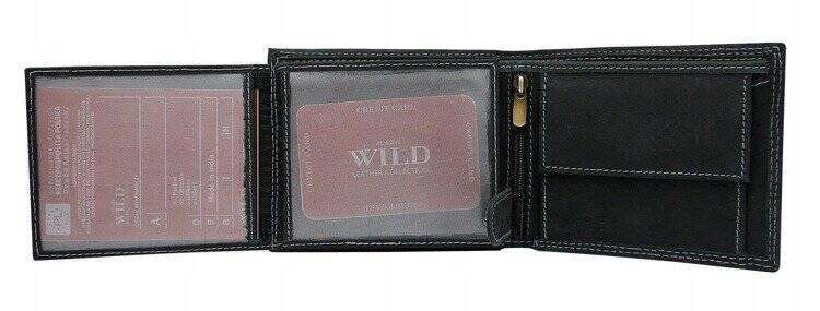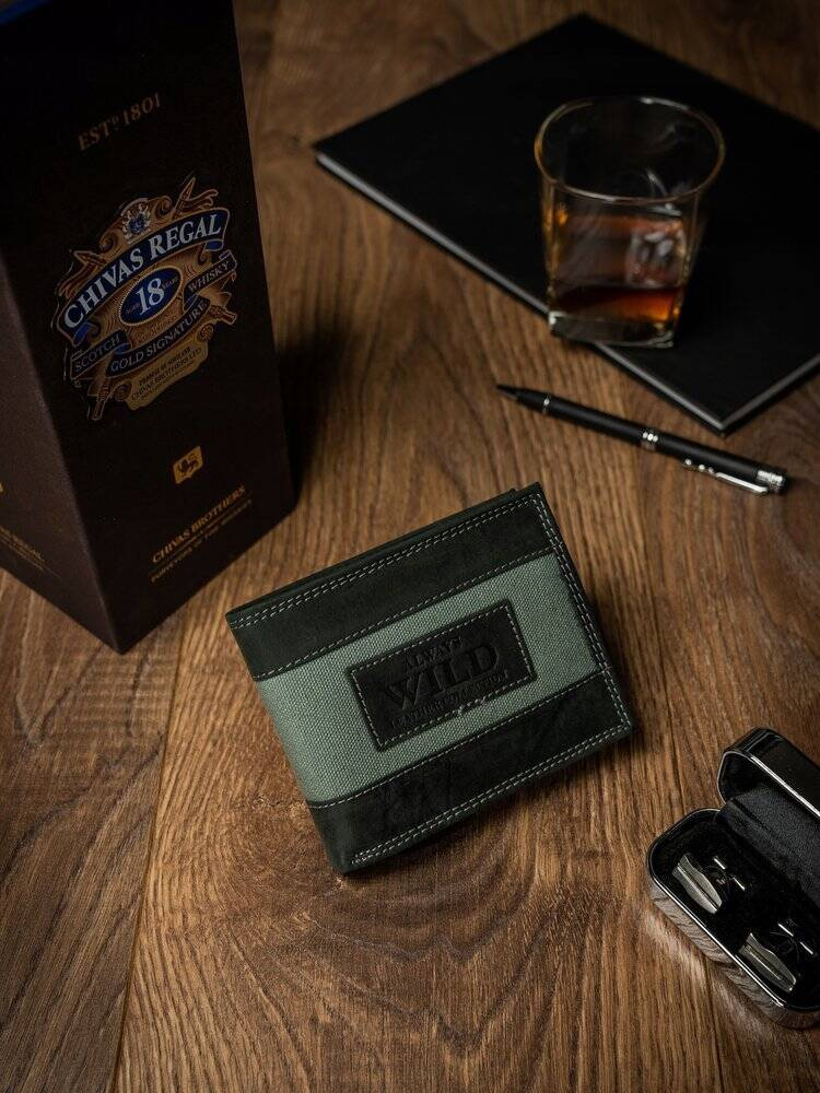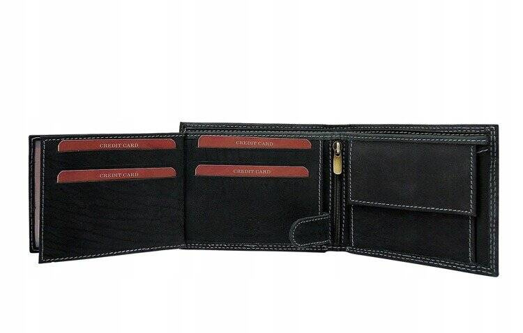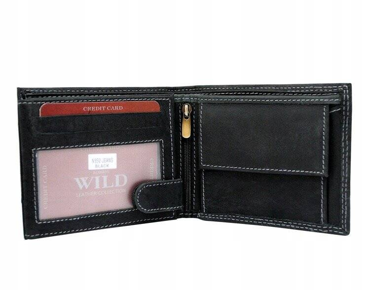 Portfel wykonany ze skóry naturalnej nubukowej i jeansu, obszyty kontrastującą nitką. Niepowtarzalny portfel o ciekawym designie. Część na karty i dokumenty zabezpieczona jest dodatkowym zapięciem. W centralnej części portfela dodatkowy schowek na suwak. Portfel zapakowany w eleganckie pudełko - doskonały na prezent.