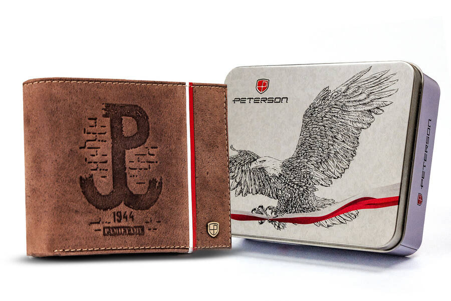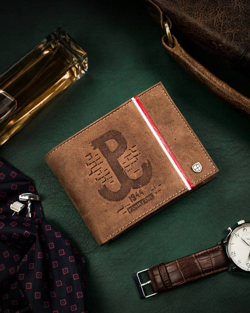 • Portfel dla Patrioty | Portfel o klasycznej stylistyce. Model w orientacji poziomej bez zapięcia zewnętrznego. Na froncie mieści się tłoczony wzór upamiętniający Powstanie Warszawskie;