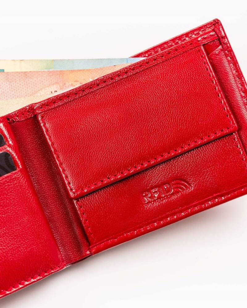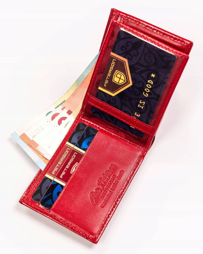 - 1 przegroda na banknoty wyszyta po całej szerokości portfela