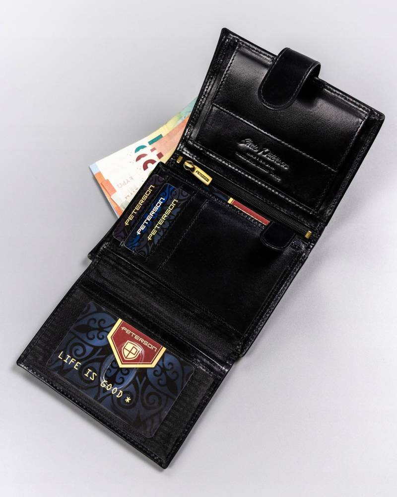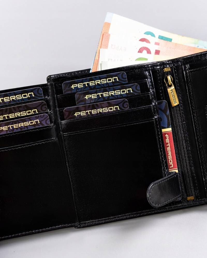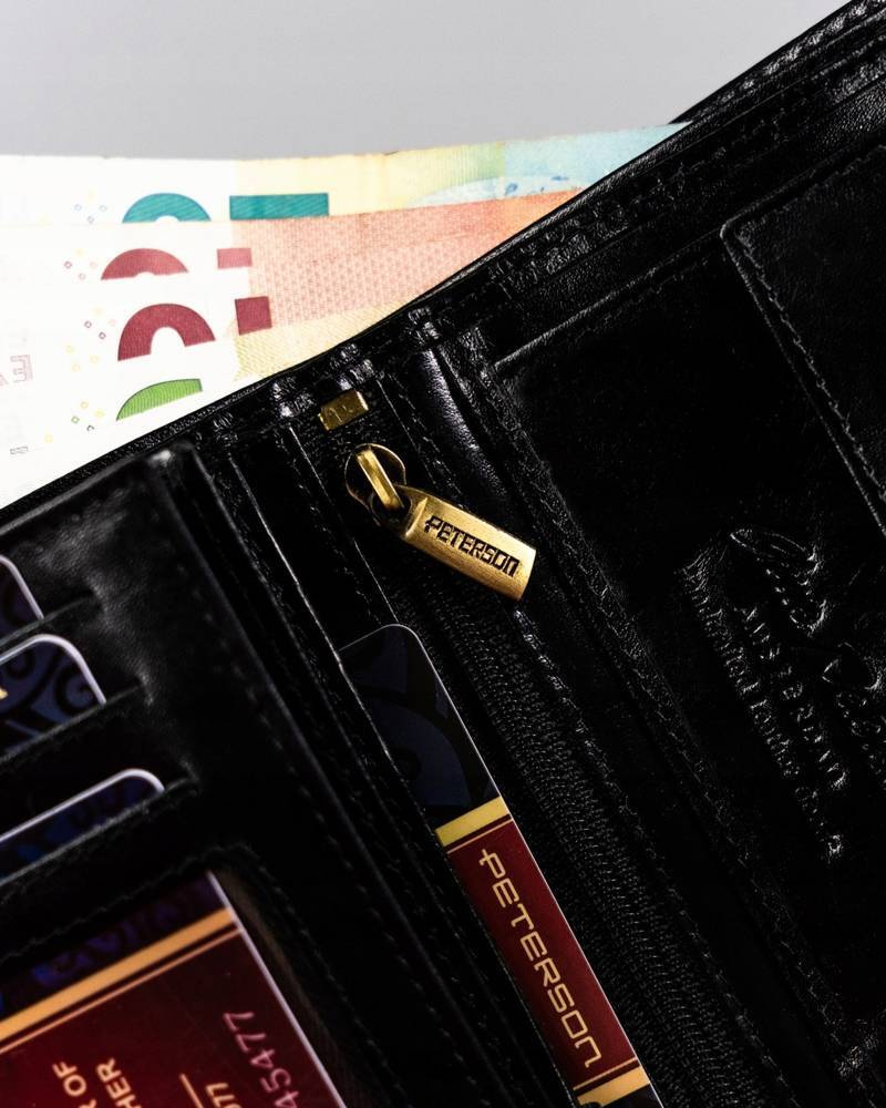 - banknoty schowasz do 2 otwartych przegródek wyszytych po całej szerokości portfela.