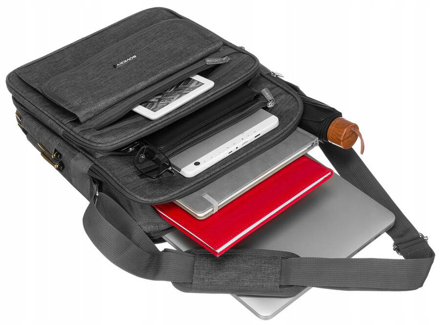 Torebka ma 2 pojemne komory, do których dostępu strzeże zamek błyskawiczny. Wewnątrz jednej z komór wyszyto kieszonkę zapinaną na suwak. Tył listonoszki zawiera kolejną, zamykaną bezpiecznym suwakiem kieszeń. Dodatkowo, listonoszka posiada aż 4 kieszonki na froncie, trzy zapinane na suwak, czwartą klapką na rzep.