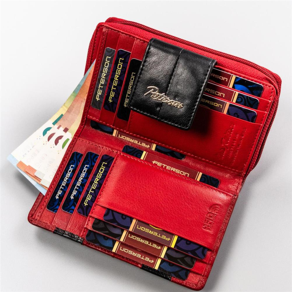 Portfel w orientacji poziomej i zapinany na suwak oraz nap. Kieszenie na pieniądze, również wyściełane są odporną na otarcia podszewką.
