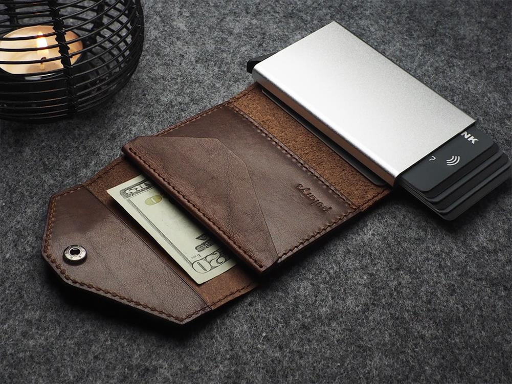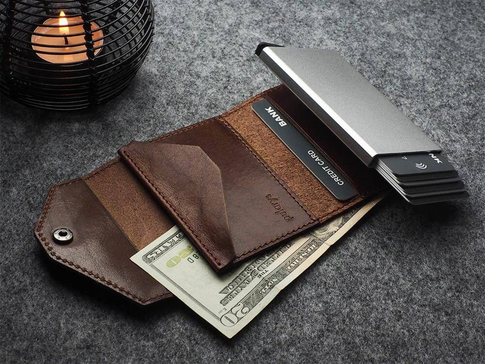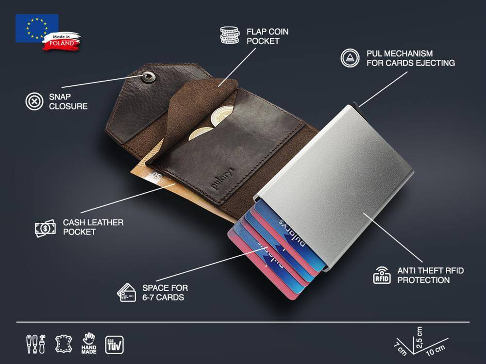Rozmiar: 6,5 x 10 x 2,5 cm Materiał: Skóra Nomad Mieści 7 kart Kieszeń na banknoty Kieszonka na monety Wzór zarejestrowany ® Zabezpieczenie RFID Przechowa wiele kart płatniczych i dokumentów. Specjalny mechanizm stopniowego wysuwania kart - "pul", zapewnia do nich szybki i łatwy dostęp. Dodatkowa kieszeń na banknoty oraz kieszonka na bilon. Dzięki zastosowanej w jego konstrukcji technologii blokowania RFID, Twoje dane oraz środki na kartach płatniczych są całkowicie bezpieczne i chronione przed nieautoryzowanym skanowaniem lub kradzieżą. Portfel został starannie zapakowany w eleganckim pudełku .