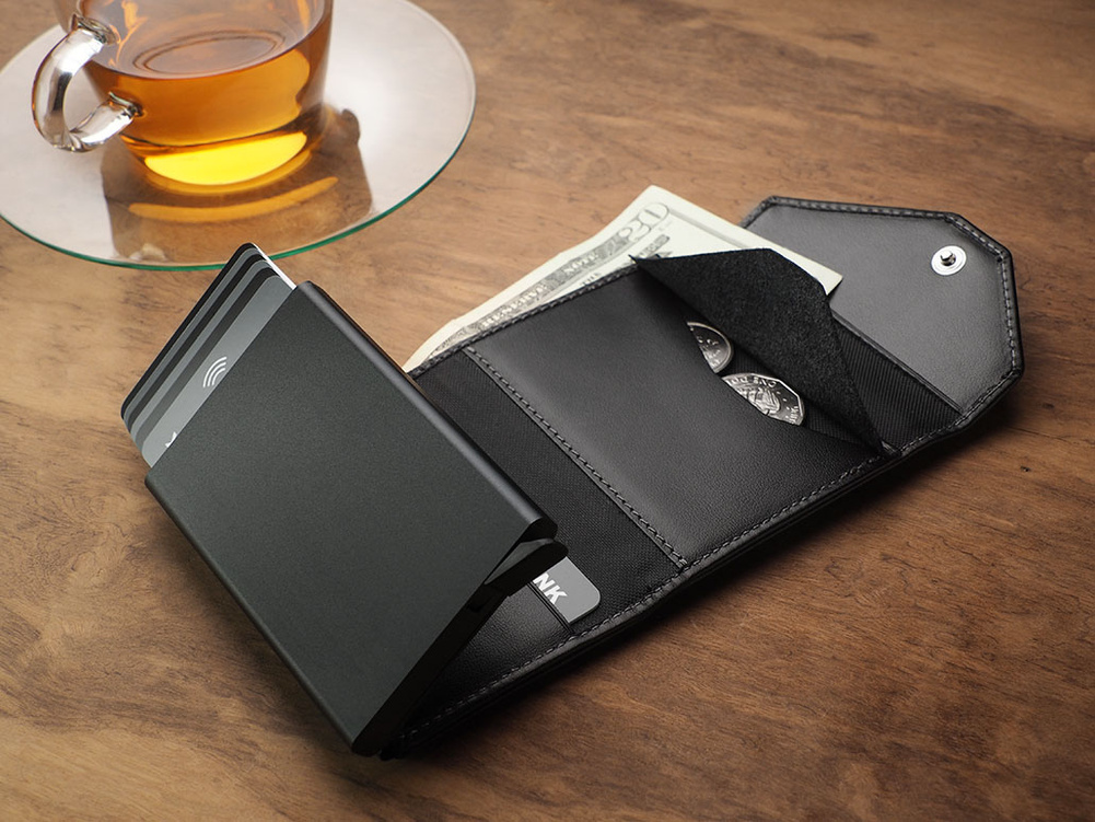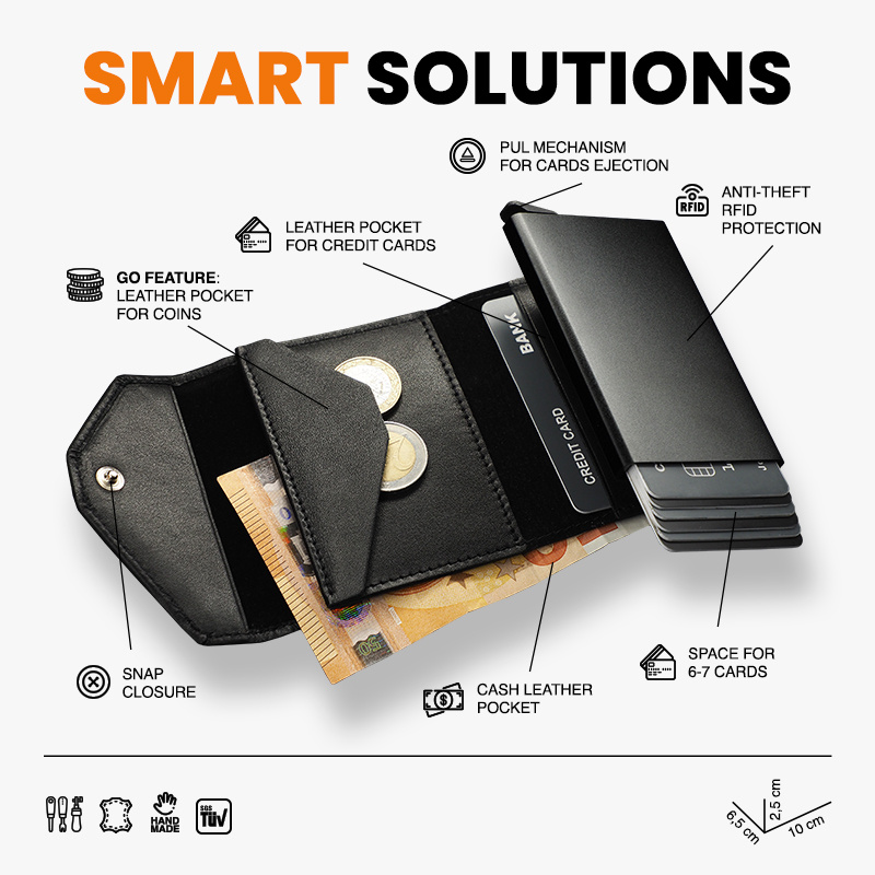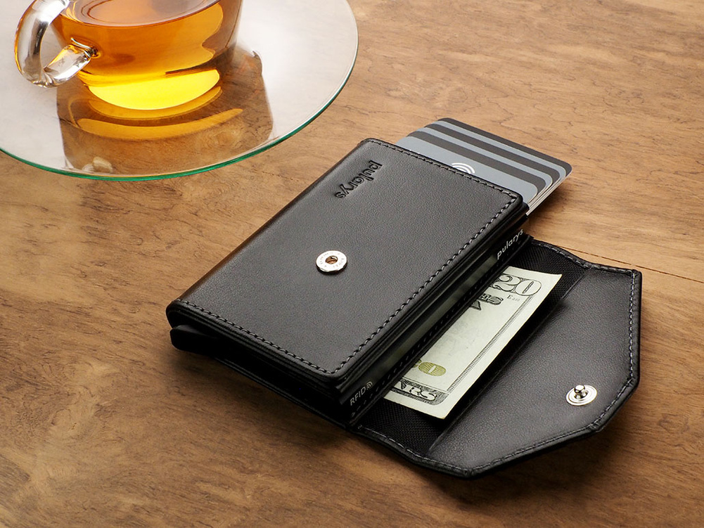 Rozmiar: 6,5 x 10 x 2,5 cm Materiał: Skóra Italia Mieści 7 kart Kieszeń na banknoty Kieszonka na monety Wzór zarejestrowany ® Zabezpieczenie RFID Wykonany z miękkiej w dotyku skóry Italia. Duża pojemność: portfel przechowa wiele kart i banknoty, a także niezbędny bilon. Łatwa dostępność: specjalny mechanizm stopniowego wysuwania kart pozwala szybko sięgnąć po tę, której szukamy. Technologia blokowania RFID zapewnia pełną ochronę Twoich kart płatniczych oraz dokumentów w każdym miejscu i o każdym czasie. Wrażliwe dane osobowe oraz środki pieniężne są zabezpieczone przed kradzieżą lub nieautoryzowanym skanowaniem. Portfel zapakowany został w eleganckie pudełko prezentowe .