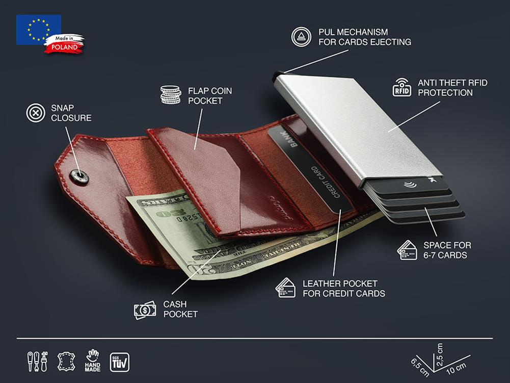 Rozmiar: 6,5 x 10 x 2,5 cm Materiał: Skóra Nomad Mieści 7 kart Kieszeń na banknoty Kieszonka na monety Wzór zarejestrowany ® Zabezpieczenie RFID Przechowa wiele kart płatniczych i dokumentów. Specjalny mechanizm stopniowego wysuwania kart - "pul", zapewnia do nich szybki i łatwy dostęp. Dodatkowa kieszeń na banknoty oraz kieszonka na bilon. Dzięki zastosowanej w jego konstrukcji technologii blokowania RFID, Twoje dane oraz środki na kartach płatniczych są całkowicie bezpieczne i chronione przed nieautoryzowanym skanowaniem lub kradzieżą. Portfel został starannie zapakowany w eleganckim pudełku .