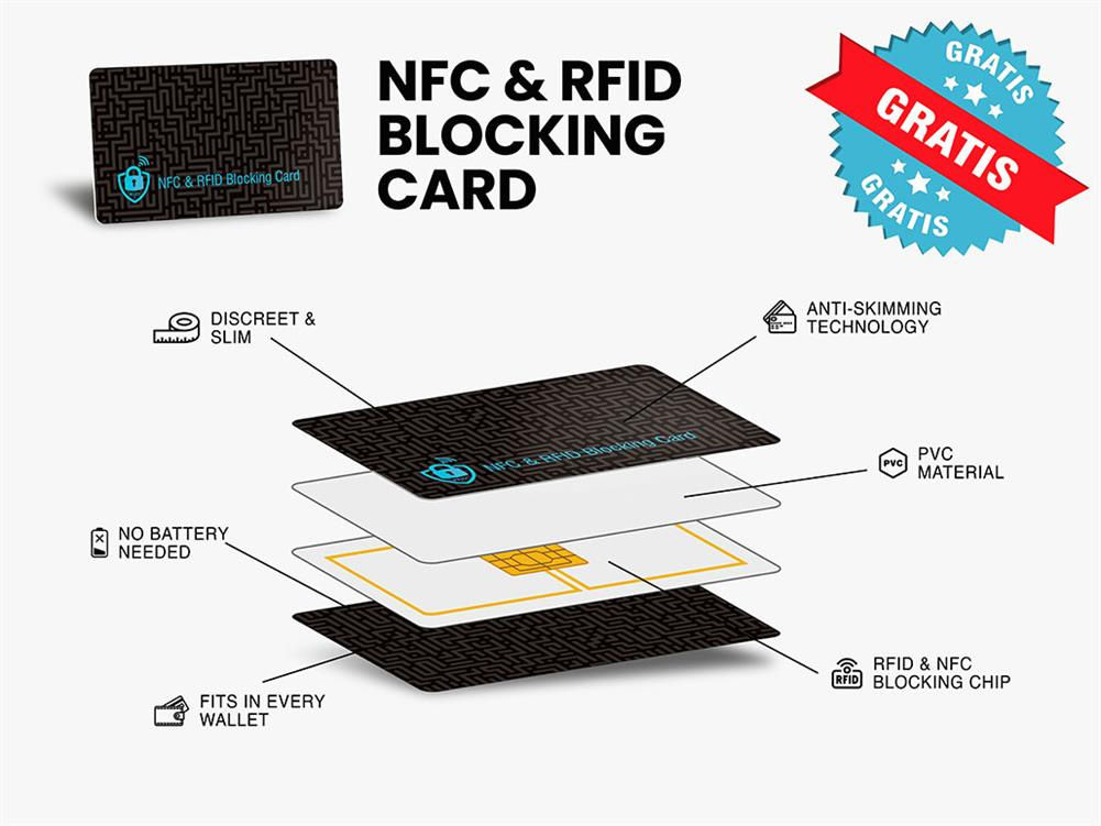 Zawiera kartę blokującą sygnały NFC i RFID