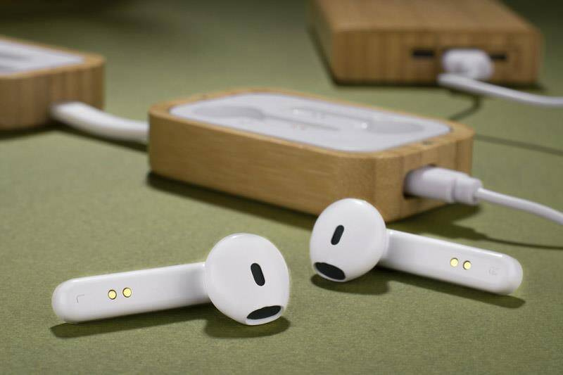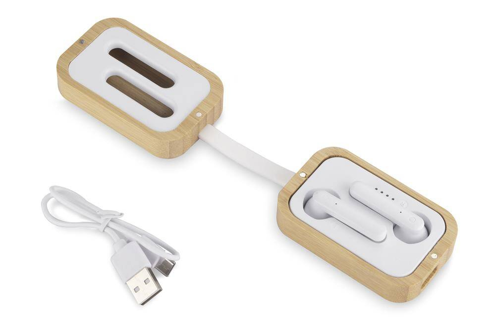 Słuchawki bezprzewodowe BAHO są obudowane w bambusowe etui zamykane magnetycznie. Dzięki swej ciekawej i nietypowej formie nikt nie przejdzie obok nich obojętnie. Wyposażone są w wskaźnik naładowania dzięki czemu nigdy nie zaskoczy Cię niski poziom baterii w urządzeniu. Dotykowe sterowanie słuchawek zapewnia wygodę użytkowania. Słuchawki posiadają wbudowany mikrofon, co pozwala na prowadzenie rozmów. Możliwość używania tylko jednej słuchawki. Dane techniczne: wersja Bluetooth: V5.1, zasięg Bluetooth: do 10m, pojemność baterii w każdej słuchawce: 30 mAh, pojemność baterii w etui: 200 mAh, czas pracy do 3 godz., port ładowania typu-c.