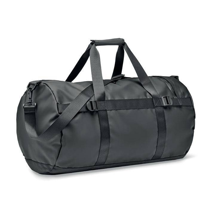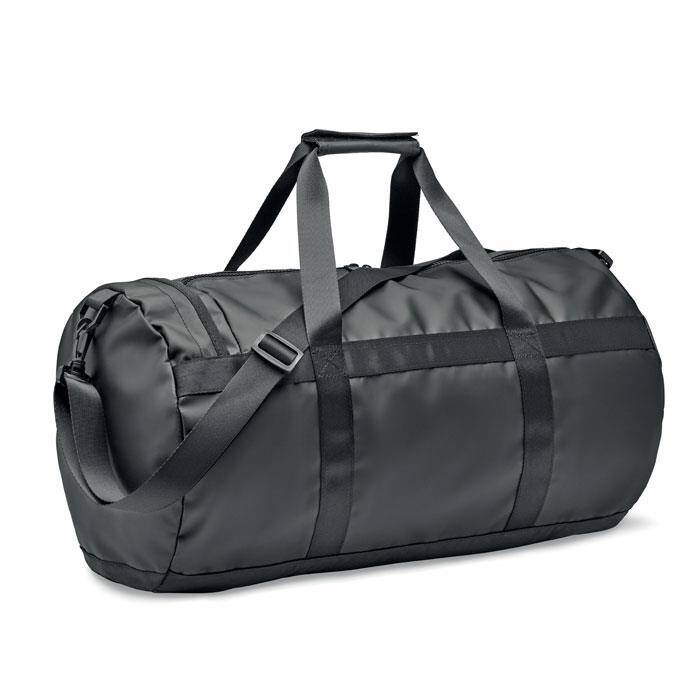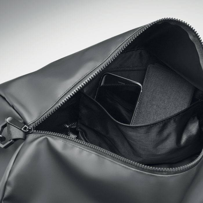 Torba sportowa lub podróżna z tkaniny tarpaulin 50C z boczną przegrodą zapinaną na zamek i wewnętrzną kieszenią zapinaną na zamek.