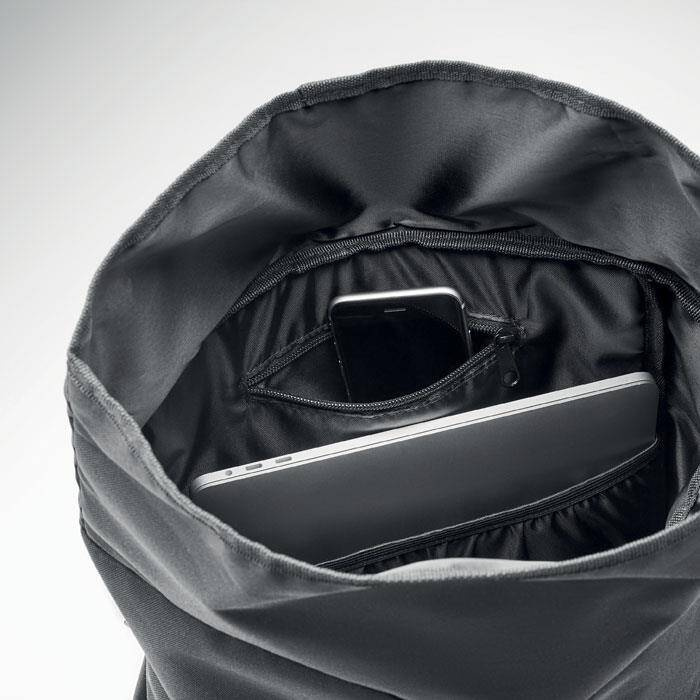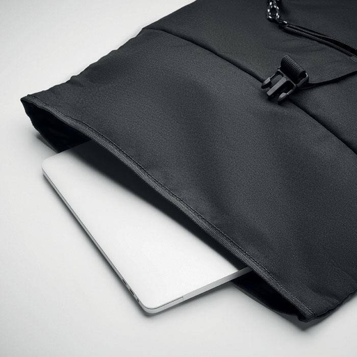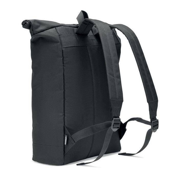 Plecak typu rolltop z poliestru 600D RPET z wyściełanymi plecami i wzmocnionym dnem. Przednia kieszeń zapinana na zamek błyskawiczny. Podszewka wykonana z poliestru 210D RPET.