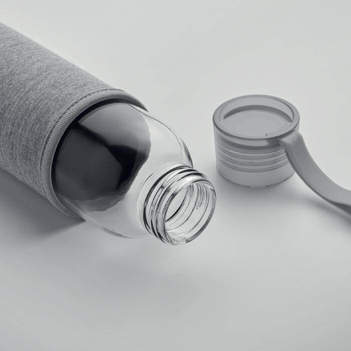 Szklana butelka z recyklingu z neoprenowym etui, z zakrętką z PP i z silikonową zawieszką.