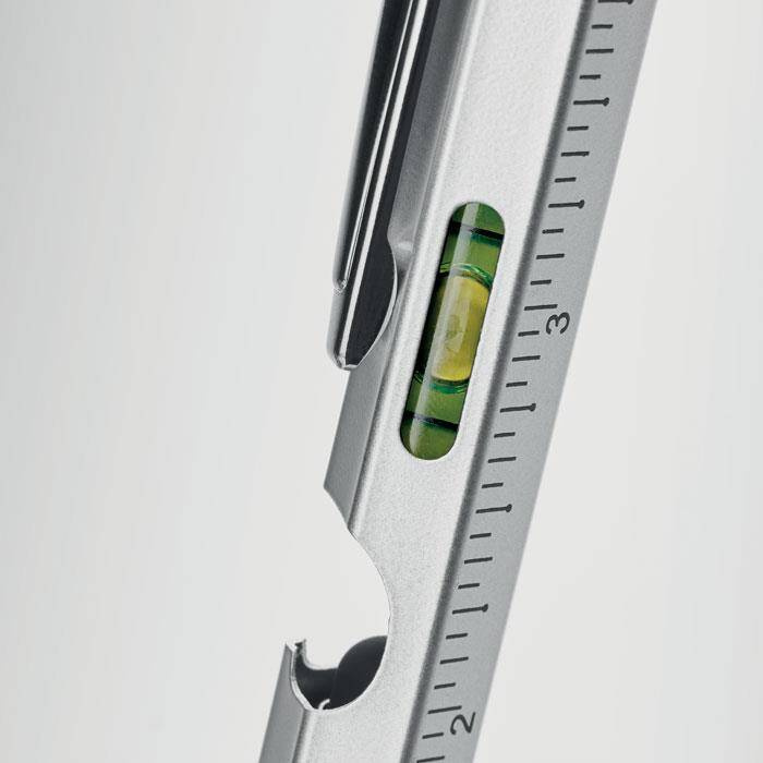 Długopis ze stali nierdzewnej z poziomicą, linijką, rysikiem i końcówką śrubokrętu krzyżakowego i płaskiego oraz z diodą LED. 3 baterie AG w zestawie.