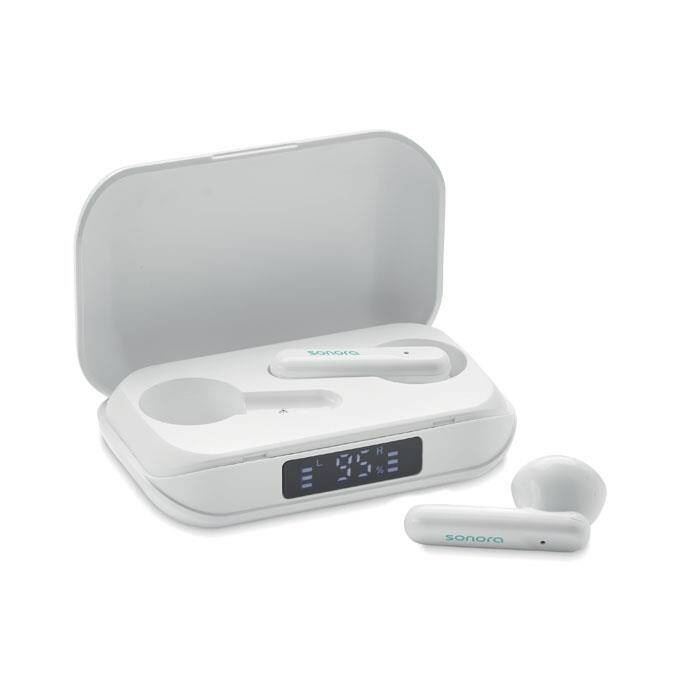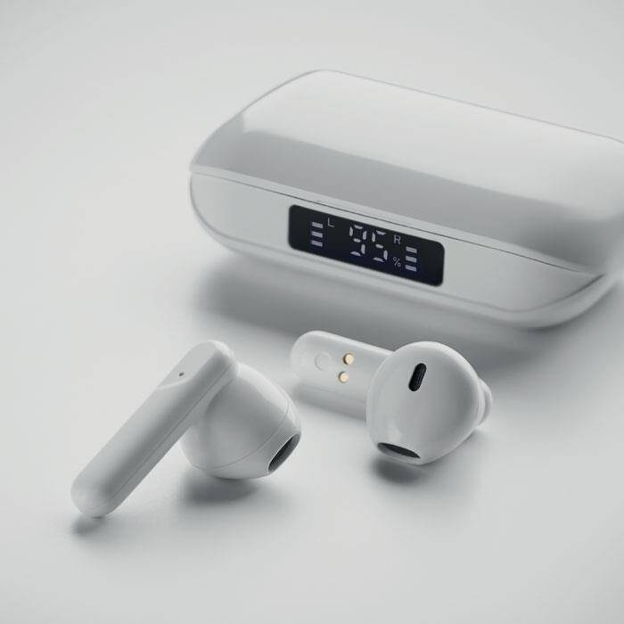 Bezprzewodowe, stereofoniczne słuchawki douszne z ABS z recyklingu True Wireless Stereo (TWS) 5.3 z mikrofonem i wbudowanym akumulatorem 25 mAh. czas odtwarzania ok. 3 godziny. Posiada wyświetlacz LCD poziomu naładowania. Automatyczne parowanie. W zestawie kabel do ładowania typu C oraz stacja ładująca o pojemności 250 mAh.