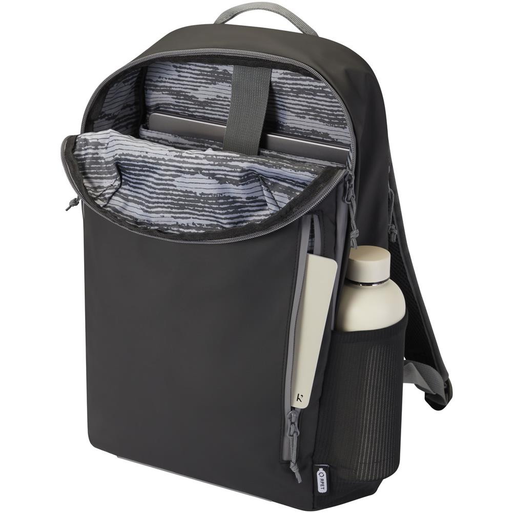 Wodoodporny plecak na laptopa wykonany z materiałów z recyklingu posiadających certyfikat GRS, w tym zamków błyskawicznych. Posiada wyściełaną przegrodę na 15-calowego laptopa z bocznym otworem zapewniającym szybki dostęp, wiele kieszeni z siatki, przednią kieszeń zapinaną na zamek oraz odblaskowe lamówki zapewniające widoczność. Wyprofilowany i wyściełany spód oraz regulowany pasek na klatkę piersiową sprawiają, że jest wygodny do noszenia nawet, gdy jest w pełni załadowany. Materiały z recyklingu GRS obejmują główny materiał, podszewkę, taśmy i zamki błyskawiczne. Pojemność: 21 litrów. Wolne od PVC.