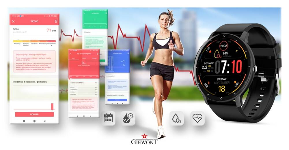 Dzięki sensorowi możesz w każdej chwili zmierzyć lub wykonać pomiar: ciśnienie krwi, tętno lub saturację - zawartość tlenu we krwi w swoim organizmie. Kontroluj wyniki podczas każdej aktywności fizycznej. Niezależnie czy jeździsz na rowerze, biegasz, czy też po prostu jesteś w pracy lub odpoczywasz. Twój smartwatch Giewont stanie się osobistym asystentem dbającym o twoje zdrowie każdego dnia.