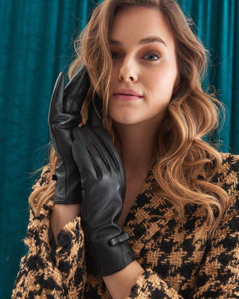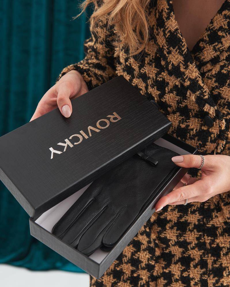 Ocieplane rękawiczki damskie ze skóry naturalnej z kokardką — Rovicky