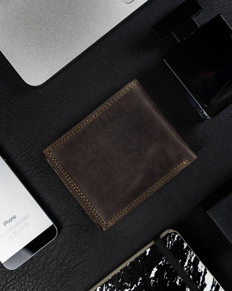 Stylowy portfel o klasycznym, poziomym fasonie. Faktura materiału oraz obszycia z grubej nici nadają mu wyjątkowo męskiego charakteru.