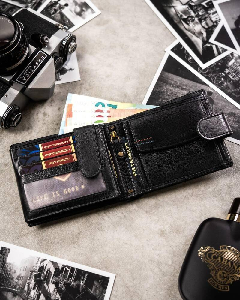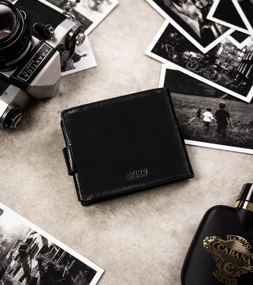 Elegancki męski portfel o ponadczasowym wyglądzie. Idealny dla mężczyzn w każdym wieku. Wykonany ze skóry naturalnej o żyłowanej teksturze i subtelnym wykończeniu. Portfel posiada na swej powierzchni tłoczenia potwierdzające, że jest skórzany i że wyposażono go w ochronę RFID.