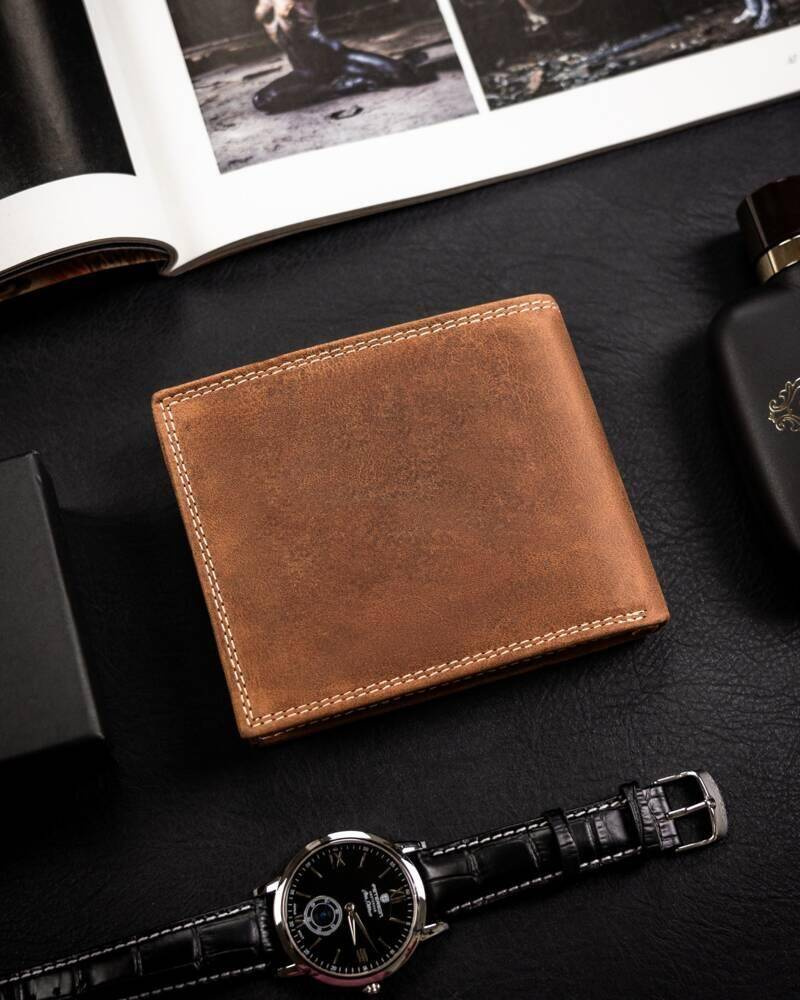 Portfel odszyty z trwałej nubukowej skóry naturalnej.