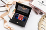 Model w orientacji poziomej, zamykany na zatrzask. Front ozdobiony złotym logo marki.