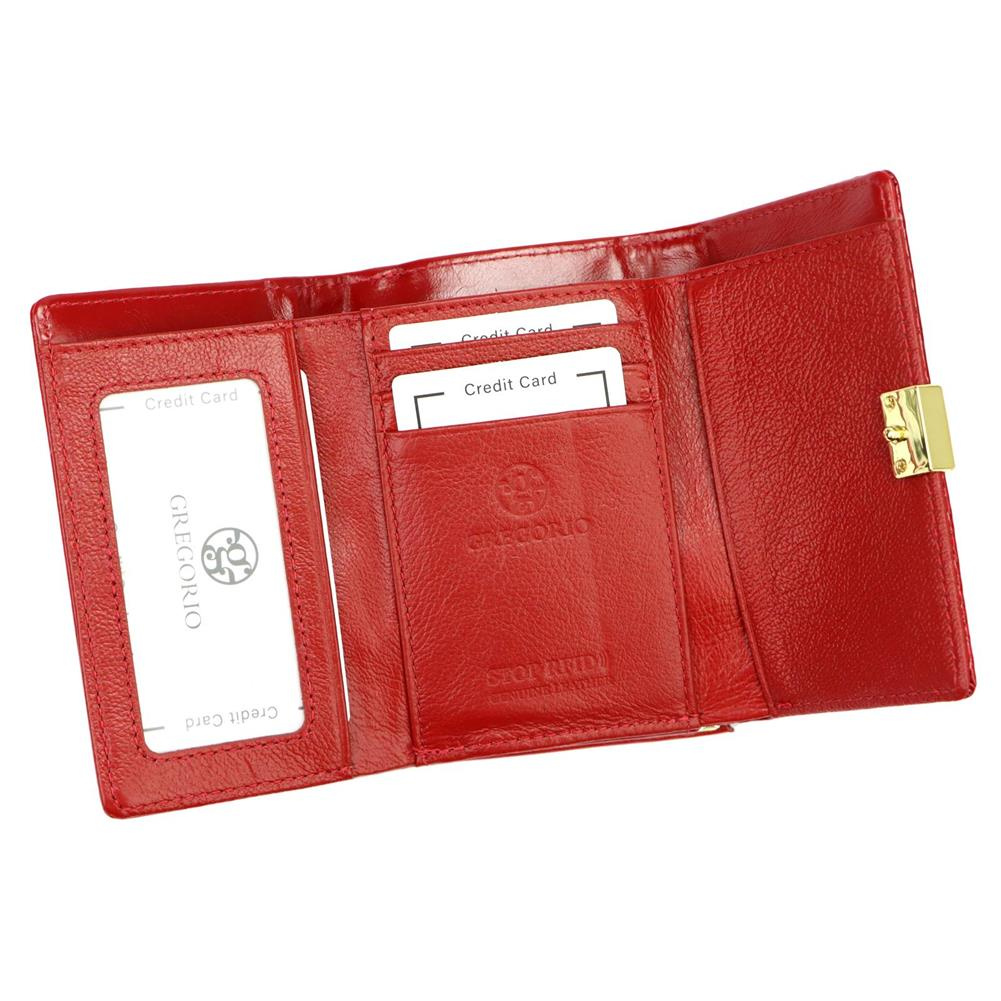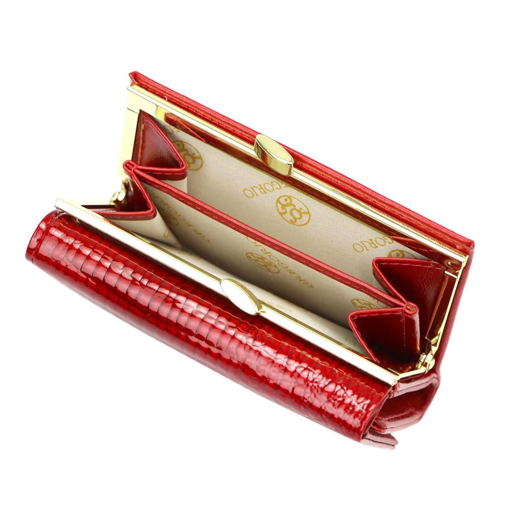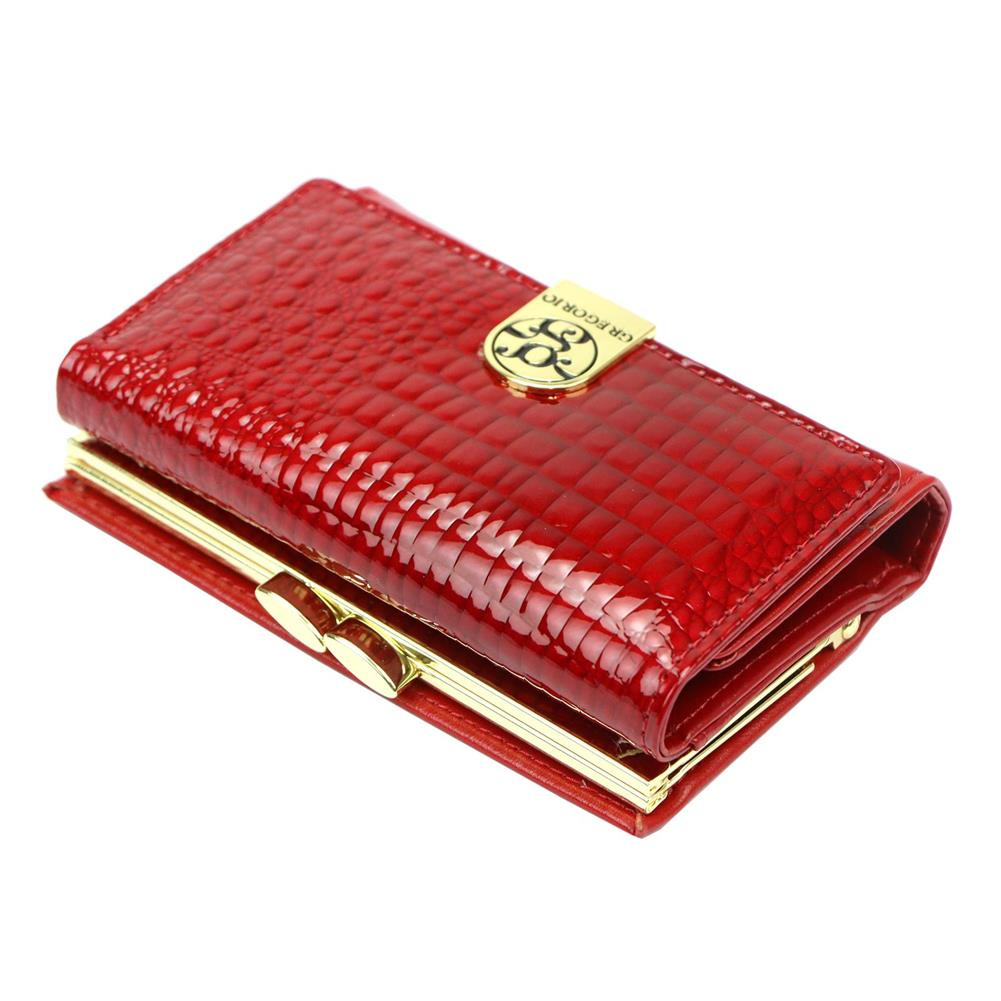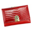 Nieduży portfel damski, wykonany z najwyższej jakości naturalnej, włoskiej skóry licowej, częściowo wytłoczonej w rysunek skóry krokodyla i lakierowanej.