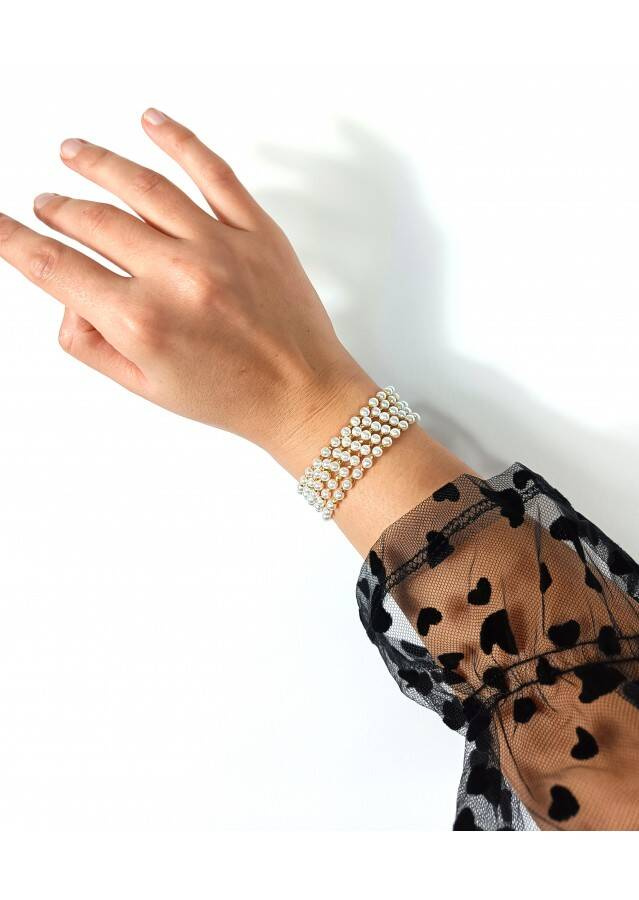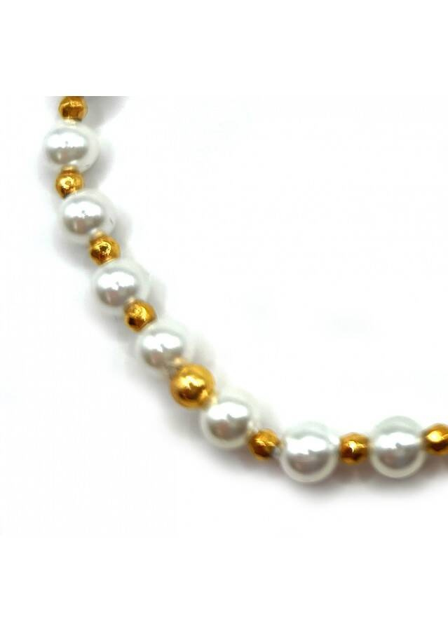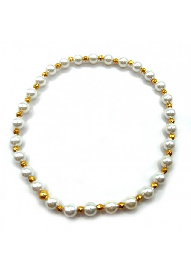 Bransoletka wykonana ze srebra próby 925, pozłacanego 24 karatowym złotem. Kamień: Perła i Hematyt Rozmiar kamienia: 4/2mm Długość: 17,5 cm  Zapięcie: gumka Bransoletka może być wykonana na zapięciu- prosimy o informację w uwagach do zamówienia Biżuteria ręcznie wykonana, produkt Polski.