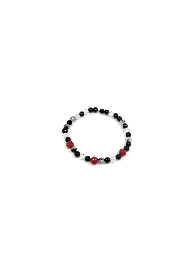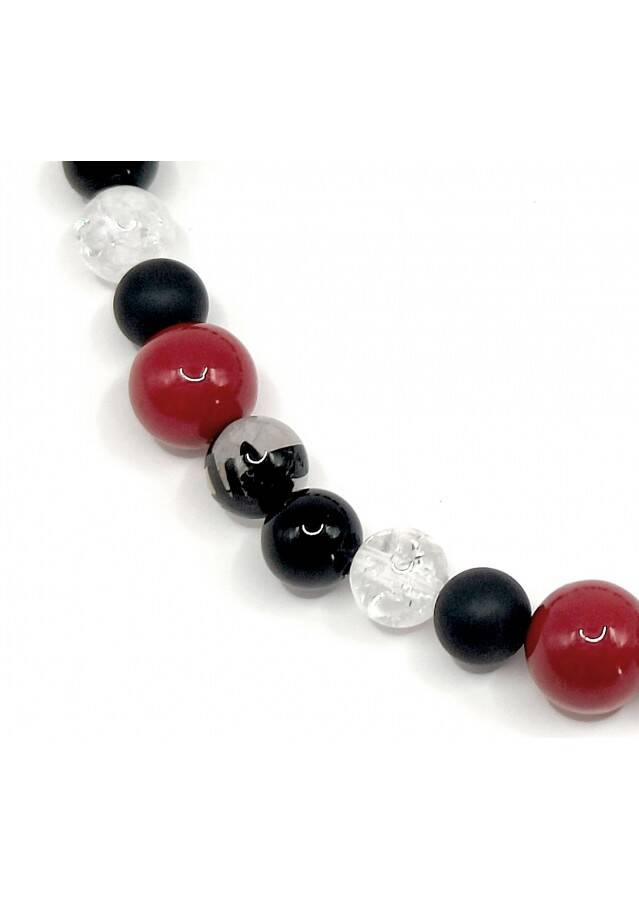 Bransoletka wykonana na gumce Kamień: Koral+ Agat+ Kwarc+ Kryształ Rozmiar kamienia: 6mm Rozmiar uniwersalny. Produkt wykonywany ręcznie.