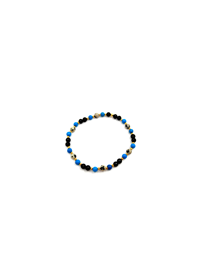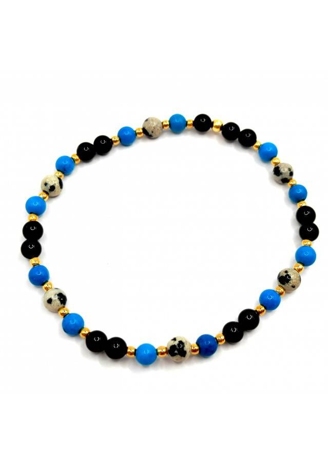 Bransoletka wykonana ze srebra próby 925, pozłacanego 24 karatowym złotem. Kamień: Agat + Howlit + Jaspis i Hematyt Rozmiar kamienia: 4/2mm Długość: 17,5 cm Zapięcie: gumka Bransoletka może być wykonana na zapięciu- prosimy o informację w uwagach do zamówienia Biżuteria ręcznie wykonana, produkt Polski.