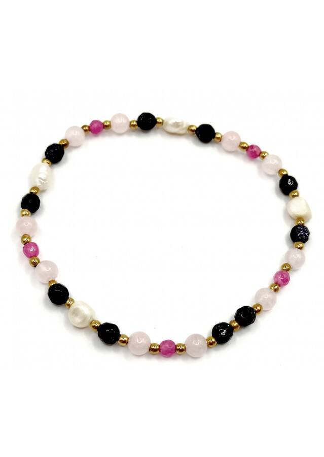 Bransoletka wykonana ze srebra próby 925, pozłacanego 24 karatowym złotem. Kamień: Noc kairu+ Kwarc + Perła + Turmalin i Hematyt Rozmiar kamienia: 4/2mm Długość: 17,5 cm Zapięcie: gumka Bransoletka może być wykonana na zapięciu- prosimy o informację w uwagach do zamówienia Biżuteria ręcznie wykonana, produkt Polski.