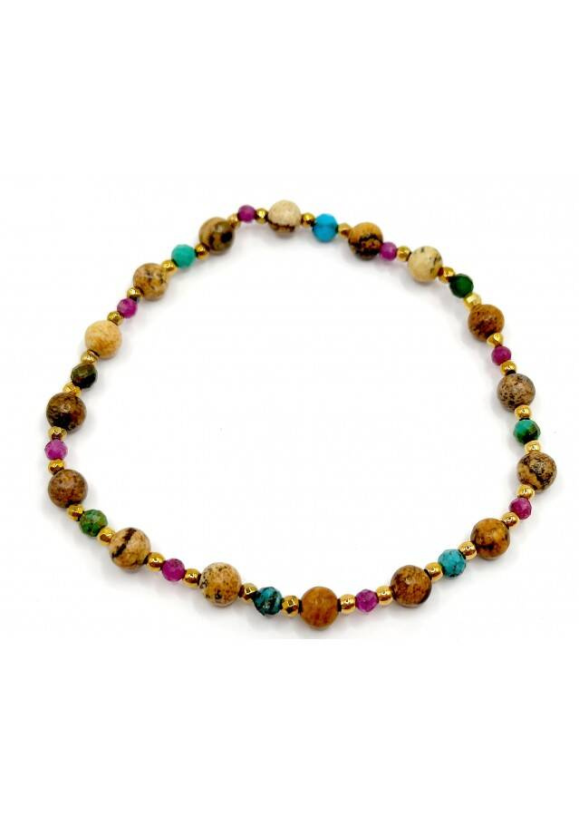 Bransoletka wykonana ze srebra próby 925, pozłacanego 24 karatowym złotem. Kamień: Turkus + Turmalin + Piryt + Jaspis i Hematyt Rozmiar kamienia: 4/2mm Długość: 17,5 cm  Zapięcie: gumka Bransoletka może być wykonana na zapięciu- prosimy o informację w uwagach do zamówienia Biżuteria ręcznie wykonana, produkt Polski.