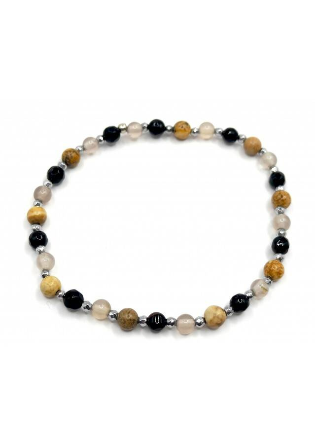 Bransoletka wykonana ze srebra próby 925, rodowanego Kamień: Kwarc + Jaspis + Spinel i Hematyt Rozmiar kamienia: 4/2mm Długość: 17,5 cm Zapięcie: gumka Bransoletka może być wykonana na zapięciu- prosimy o informację w uwagach do zamówienia Biżuteria ręcznie wykonana, produkt Polski.