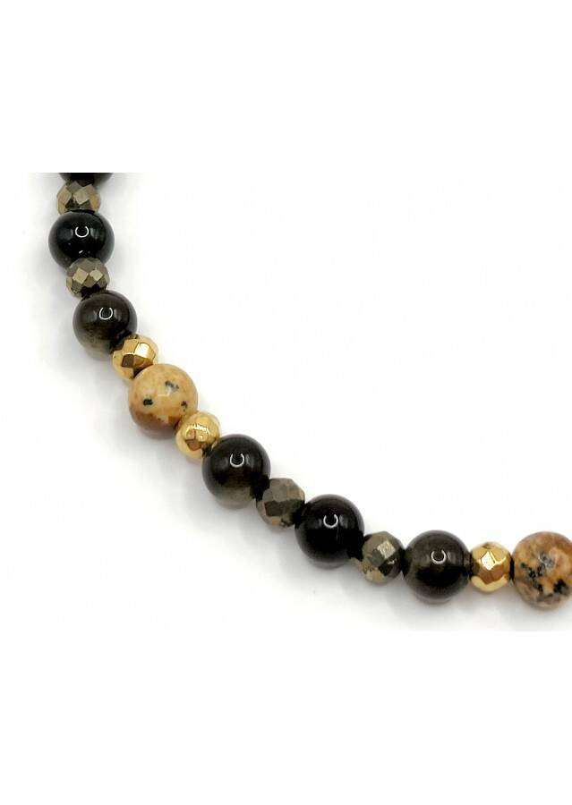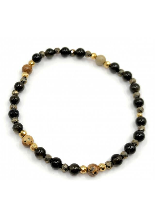 Bransoletka wykonana ze srebra próby 925, pozłacanego 24 karatowym złotem. Kamień: Turmalin + Piryt + Jaspis i Hematyt Rozmiar kamienia: 4/2mm Długość: 17,5 cm  Zapięcie: gumka Bransoletka może być wykonana na zapięciu- prosimy o informację w uwagach do zamówienia Biżuteria ręcznie wykonana, produkt Polski.