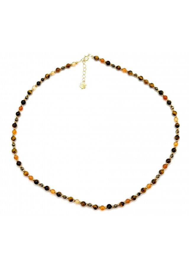 Naszyjnik wykonany ze srebra próby 925, pozłacanego 24 karatowym złotem. Kamień: Tygrysie oko + Kamień słoneczny + Piryt + Hematyt Rozmiar kamienia: 4/3/2 mm Długość: 44 cm  Długości do wyboru: 38 cm /42 cm/ 44 cm Zapięcie: klasyczne (federing) Biżuteria ręcznie wykonana, produkt Polski.